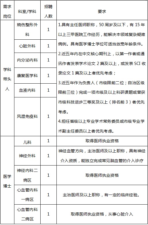 具有中华人民共和国国籍,遵纪守法,身心健康,热爱医疗卫生事业,有较强的责任心,无不良嗜好,工作积极肯干,能吃苦耐劳,服从医院工作安排,具有良好的团队合作精神,具备岗位所需的专业知识,业务技术能力强,择优录用。